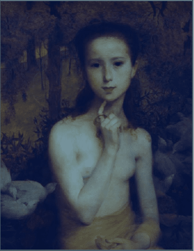 Eliseu Visconti nos mostra, com sua rigorosa precisão, esta menina nua, casta porém, cujos olhos nos fazem perguntas e parecem imunes ao tempo.